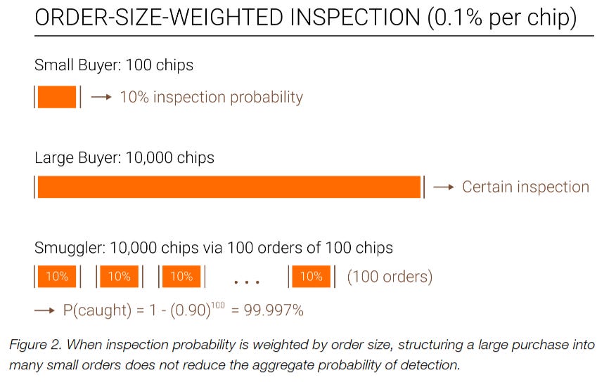 The probability of those audits would be order-weighted. In other words, the bigger the purchase, the more likely it is to be subject to an onsite inspection. This creates an obvious workaround: structuring. Criminals could import chips and other controlled goods in multiple small batches to reduce the probability of inspections. The authors have thought about this. And they contend that the weighted system would still likely result in at least one of those structured orders being detected:
