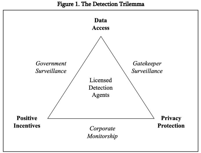 Trilemmas are all about trade-offs. In a perfect world, we would want our detection systems to feature all three policy attributes in bold. Specifically, we would want the detection agents to possess the necessary data and positive incentives to identify suspicious activity. And, for privacy purposes, we would want a system that protects customers from direct state surveillance.10 But no existing detection system (italicized) can deliver all three elements simultaneously. Rather, each features the adjoining attributes in Figure 1 while lacking the one opposite.